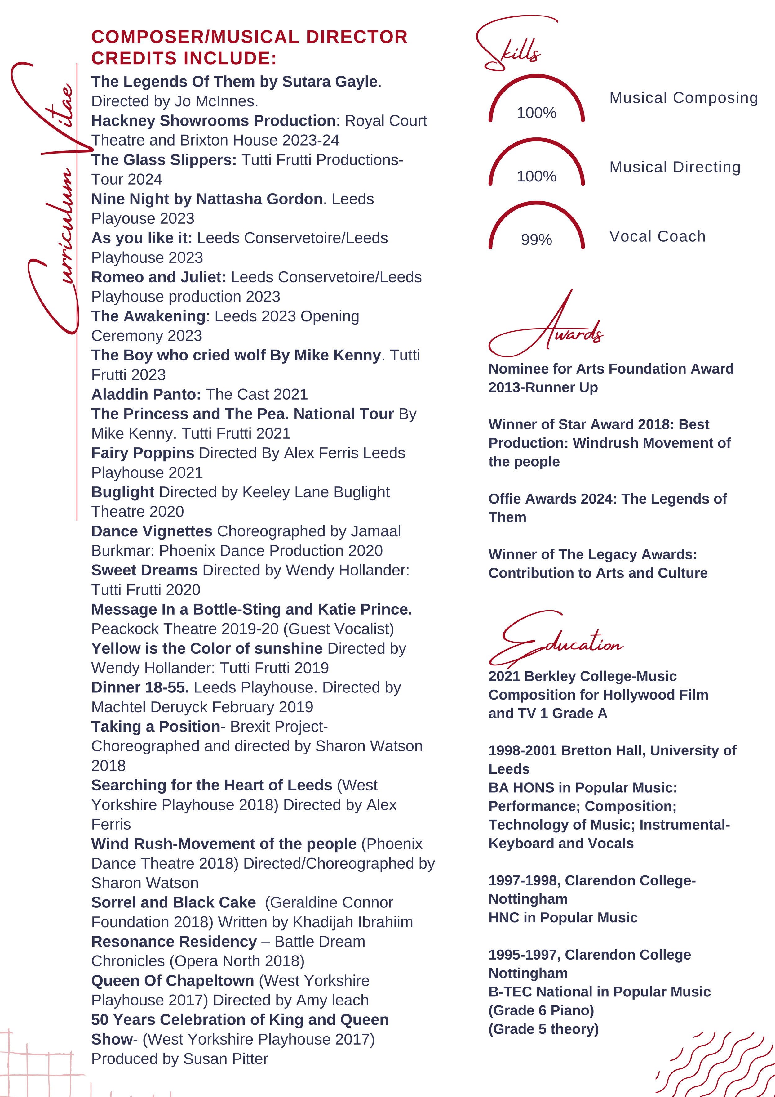 Christella Litras is an extraordinary talent whose musical expertise and leadership have had a profound impact on the creative industry. Her ability to compose, direct, and mentor with such authenticity and passion sets her apart as a true innovator in the field. Having worked with Christella on WindRush: Movement of the People, I witnessed firsthand her remarkable ability to bring stories to life through music. Her compositions not only elevated the production but also created a deeply emotional connection with audiences. She has an incredible gift for working with both seasoned professionals and emerging artists, ensuring that every performer feels supported, valued, and inspired. Christella's vast experience across multiple genres, combined with her deep understanding of cultural influences, makes her an asset to any creative team. She is a visionary who continuously pushes artistic boundaries, and her dedication to excellence is evident in every project she undertakes. It is always a privilege to collaborate with someone of her calibre.